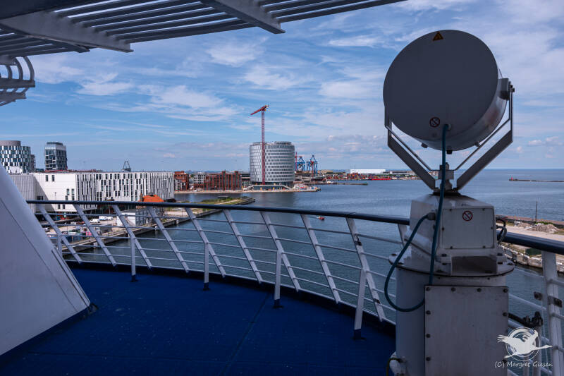 Kurz vor dem Ablegen in Kopenhagen war wenigstens eine unserer Kabinen fertig, so dass wir unser Gepäck deponieren und uns zu den Aussichtsdecks aufmachen konnten, um das Auslaufen zu beobachten.