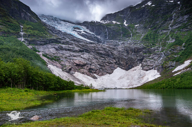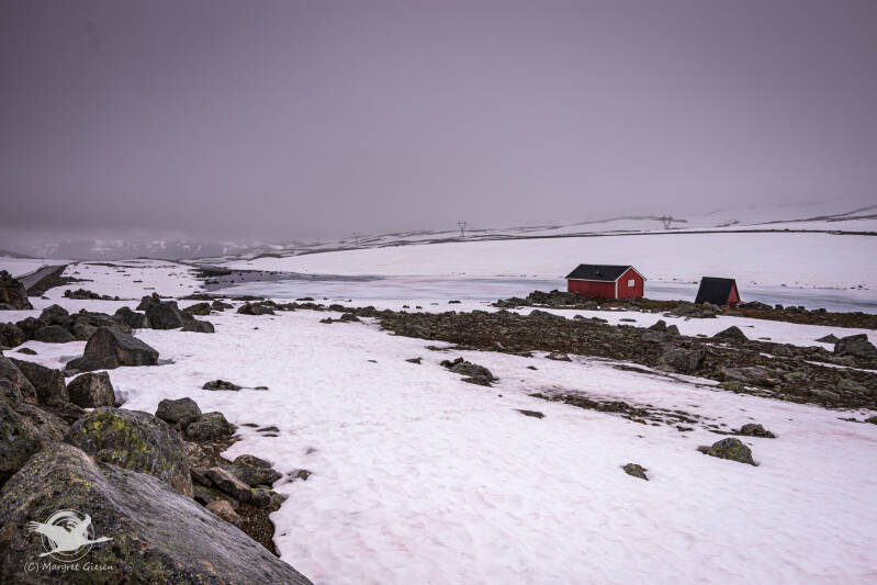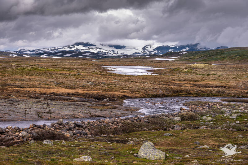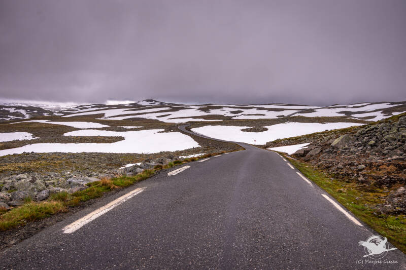 Mit der ersten Kehre passierten wir den Sendefossen, der Unmengen tosenden Wassers führte. Oben auf dem Vikafjell angekommen ging der Regen bei +4°C langsam in Schneeregen über und es empfing uns ein eisiger Wind. Aber trotz des Wetters, mein Fotografenherz lebte auf, denn nichts ist schöner als mystische Nebelstimmung. Und dann noch die Seen auf der Hochebene mit Eis und Eisbergen bestückt und dazu das frische Grün des Sommers.