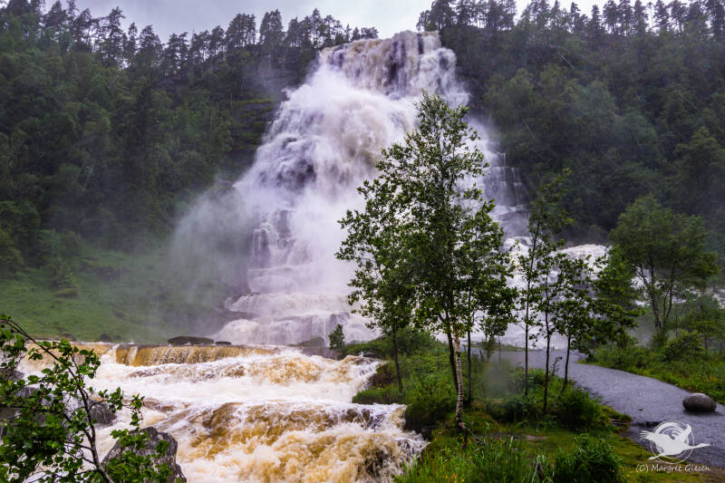 Der Tvindefossen führte dank der ausgiebigen Regenfälle beindruckend viel Wasser. Er kann in trockenen Sommern auch zu einem uninteressanten Rinnsal verkommen. Insofern hat ein regenreicher Sommer in Fjordnorwegen auch seine positiven Seiten.