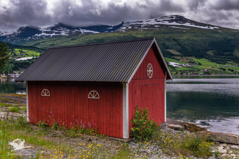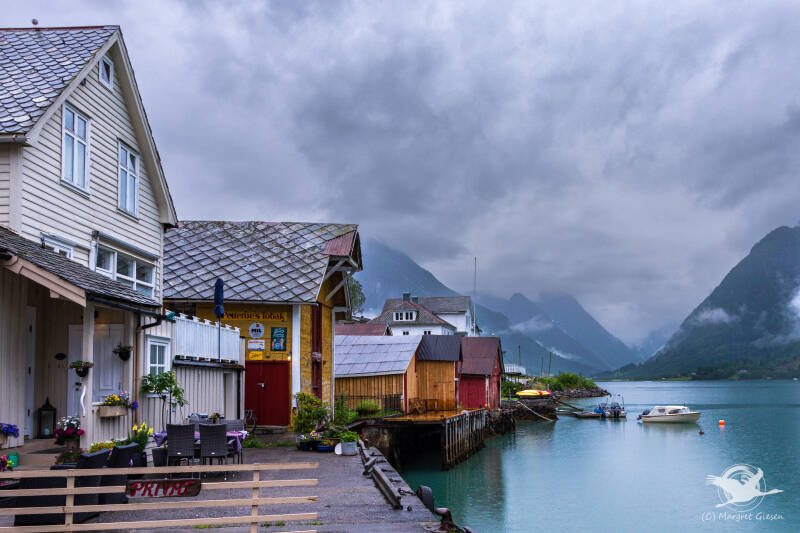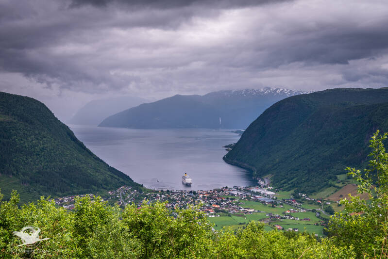 Auf der Fahrt wieder hinunter nach Vikøyri am Sognefjord kamen wir bei Vikafjellsvegen 168 vorbei, ein kleines Cafe, das nicht nur wegen seiner spektakulären Aussicht auf den Sognefjord in sämtlichen Reisebeschreibungen angepriesen wird. Die Aussicht auf eine Einkehr in dem Cafe ließ uns den Hunger und das kalte Wetter vergessen. Der Frust war groß als wir dort ankamen und leider feststellen mussten, dass das Cafe dauerhaft geschlossen ist. Wenigstens konnten wir die Aussicht genießen, denn es war mal trocken von oben! Vikøyri bot das klassische Bild von oben, wie man es in allen Reisprospekten zu Norwegen zu sehen bekommt: kleiner Ort am Fjord mit vorgelagertem Kreuzfahrtschiff. Nur - in Reiseprospekten ist das Wetter immer schön!