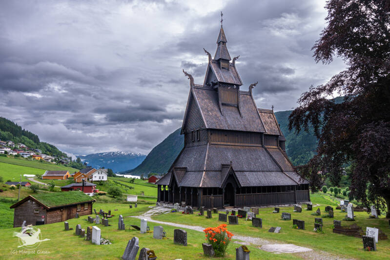 Die Ziele für den nächsten Tag waren Gudvangen und Undredal am Nærøyfjord bzw. Aurlandsfjord, die zwei südlichen Armen des Sognefjords und campen wollten wir kurz vor Auerlandsvegen in Lunde Camping. Die sehr schmale Straße nach Undredal wollten wir nicht in der Stoßzeit fahren, also durften wir heute morgen nicht trödeln. Ein Problem ergab sich stets mit den frühen Abfahrtszeiten: In Norwegen macht alles erst frühestens um 10 Uhr auf, oft erst um 11 oder 12 und wir waren meistens zu früh dran. So erging es uns in Hopperstad mit der imposanten Stabkirche, die wir leider nur von außen besichtigen konnten.