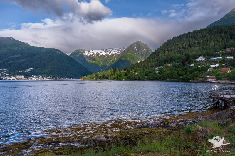 Unser Mädel hatte immer noch Fieber, sie blieb aber weiterhin negativ. Es war aber nun endgültig klar, dass wir an dem Tag nichts Großes würden unternehmen können. Am Nachmittag ging es ihr etwas besser und wir machten uns auf, den Holebrua-Wasserfall direkt im Ort zu besuchen. Es wurde eine kleine Runde durch den Ort. Geiranger hat nette kleine Cafes und Shops (die im Gegensatz zu Ålesund auch noch geöffnet hatten). Die Mädels kauften sich für 10 Euro zwei warme Jacken, bei dem Preis konnte man die nicht hängen lassen, für mich gab es einen neuen, mittlerweile heißgeliebten Kaffeebecher aus dem netten kleinen Schokoladen-Cafe und anschließend ging es in ein nettes kleines Restaurant direkt am Fjord. Zurück am Campingplatz wartete der Abend noch mit einem prächtigen Abendhimmel und mit einem Rotschenkel am Ufer auf.