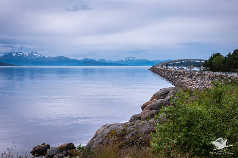Wir näherten uns dem spektakulären Teil der Atlantikstraße, der Storseisundbrücke. Mit einer Länge von nur 260 m gewinnt sie über den Sund eine lichte Höhe von 23 Metern. Die größte Steigung beträgt 6% … bei Sturm möchte man die nicht mit einem WoMo fahren! Warum die Brücke auch „Brücke ins Nichts“ genannt wird, bedarf keiner Erläuterung, wenn man die Bilder sieht.