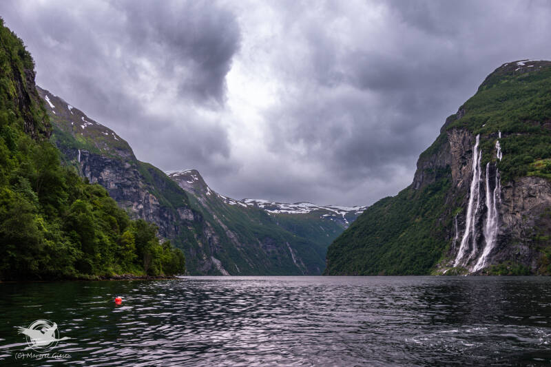 Der schnuckelige Guide gönnte uns dann auch ein Spaßprogramm … jeder, dem übel werden würde oder Panik bekäme, sollte unterwegs die Hand heben … na super, beruhigende Aussichten! Aus dem Hafen ging es noch langsam, schnell fahren darf dort keiner … aber dann … ein paar schnelle S-Kurven, Schräglagen, testen, ob einer der Passagiere kollabierte … ich fragte mich bereits nach 2 Minuten, wie ich das 50 min überleben sollte … Meine Füße hatte ich rechts und links unter den Vordersitzen eingeklemmt, mit beiden Händen die Haltegriffe der Vordersitze fest umklammert. Ich wünschte mir, ich hätte mich wegwünschen können. „Alle o.k.? Allen geht es gut?“ „Äh nee, nicht so ganz …“ „Ja, dann können wir ja loslegen!“ „Äh, es wird noch schlimmer?“ Ja, wurde es! Voll Speed auf die Felswände zu, erst kurz vorher in Schräglage abdrehen. An Fotografieren war nicht zu denken , die Kamera hing mir wie Blei um den Hals. Ich wagte es nicht, meine Hände von den Haltegriffen zu lösen. Zum Glück hielt der Guide aber hin und wieder an, so dass man in Ruhe schauen und ein paar Fotos machen konnte. Irgendwann hatte man sich etwas an die Geschwindigkeit, die Kurvenfahrten gewöhnt und wir bekamen wirklich Highlights geboten: An die großen Wasserfälle wie die „7 Schwestern“ fuhren wir ganz nahe heran. Das Wasser war zum Greifen nah und wirklich beeindruckend. Wenn man bedenkt, wie voll die großen Ausflogsboote gewesen waren und was für eine exklusive Erlebnisfahrt wir gehabt hatten, wurde auch mir klar, dass die RIB-Tour eine gute Entscheidung gewesen war. Es war ein einmaliges Erlebnis! Der Abend ging dann noch trocken zu Ende und die einsetzende Ebbe legte farbenfrohen Seetang frei und man hatte noch einen schönen Blick auf den Geirangerfjord.